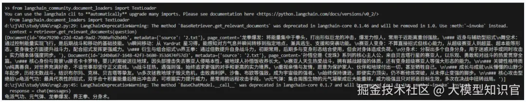 根据控制台的输出,我们可以看到系统找到的分段,并且给出了正确的结果,而且我们这里问的是卡卡罗特,而文档里面一开始说的是孙悟空,说明大模型自动识别了卡卡罗特就是孙悟空。