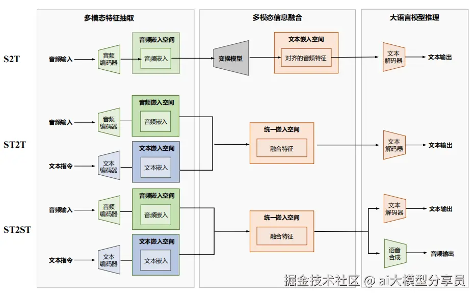 这是目前最常用的模式。它不仅能处理语音,还能接受文字提示,比如“把这段语音翻译成英语”。这种方式能做语音翻译、语音情感分析等更复杂的任务。 - ST2ST(Speech & Text-to-Speech & Text):语音 + 文本 → 语音 + 文本。