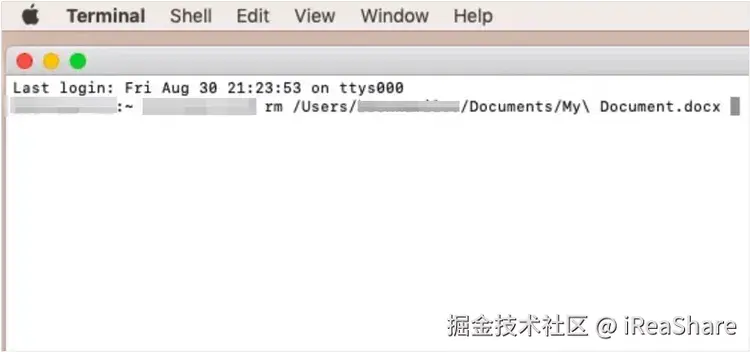 输入rm -f (注意 -f 后面的空格)。然后,将要删除的文件拖放到终端窗口中。这会自动插入文件路径。完整的命令如下所示: rm -f /path/to/the/file/File Name.ext 。