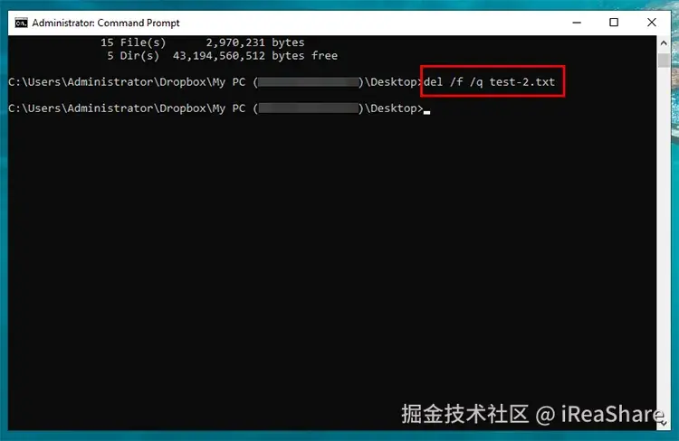 del /f /q filename.suffix,例如del /f /q test.txt;要删除文件夹及其所有内容,请使用命令 **rmdir /s /q filename.suffix。** /f参数强制删除只读文件,/q参数则以静默模式运行命令,无需确认。最后,按“回车”键。文件或文件夹现在应该已被删除。