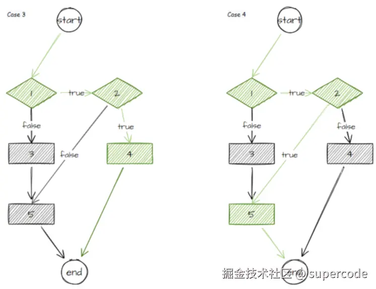 case 3 以及 case 4 中的节点 3 都会被 cancel ,因为它只能通过节点 1 -> 节点 3 的边可达(该边的属性为 false),但对于节点 5 而言,在 case 4 中因为判断节点 2 的执行结果为 true ,那么其可以通过节点 2 -> 节点 5 的边可达,所以不会被 disable 。