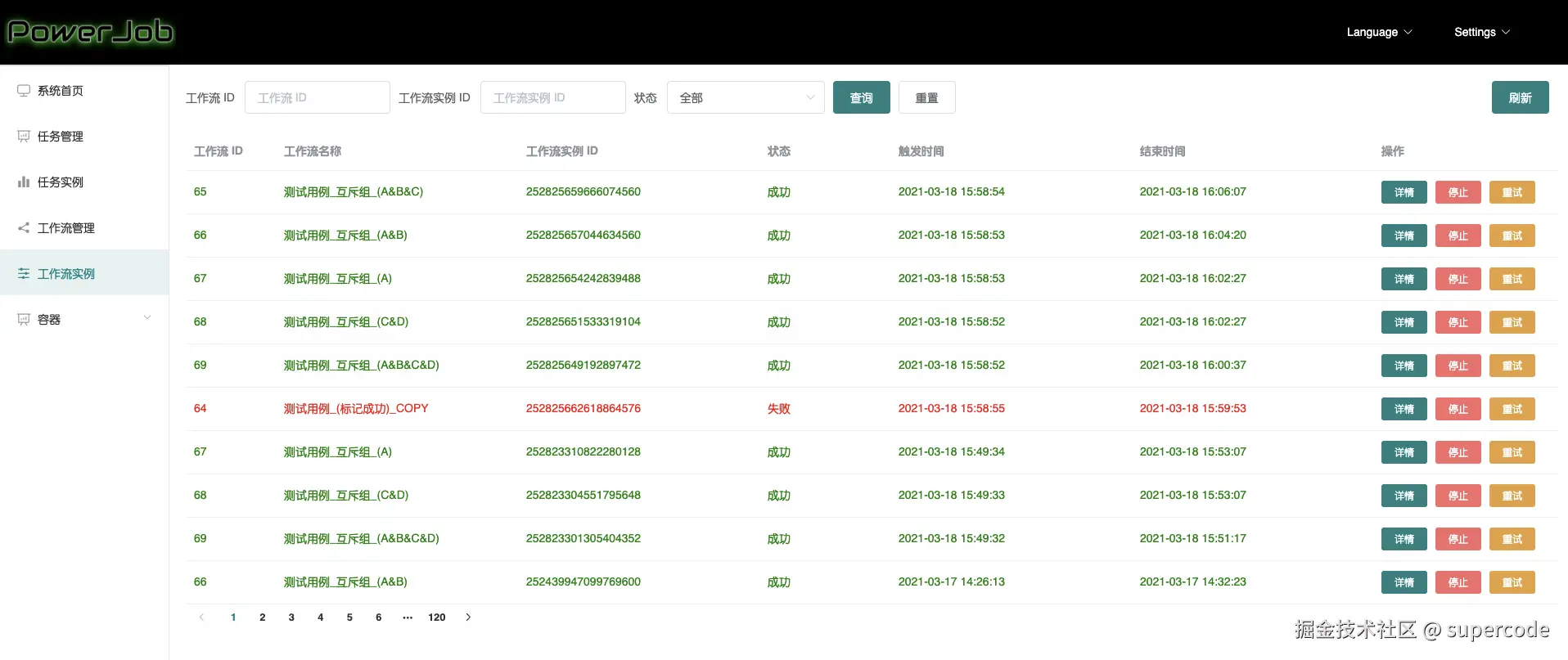 - 工作流实例的运维,允许开发者在线停止、重试某个工作流实例或运行某个工作流