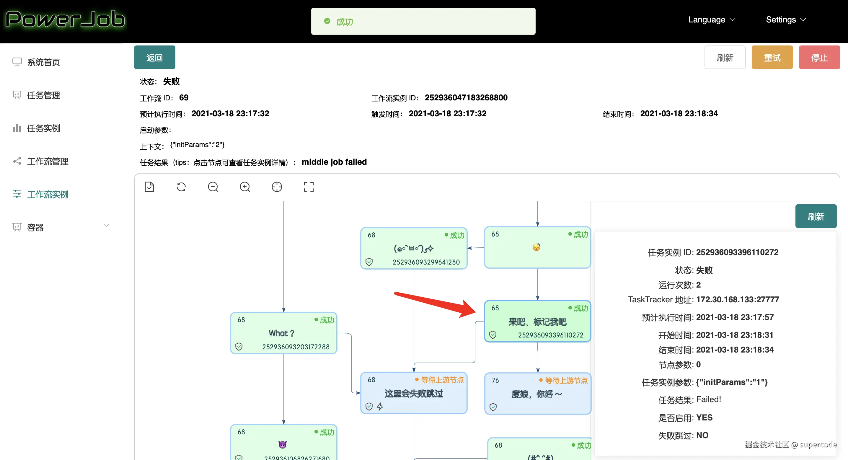重试:从当前工作流实例失败(会忽略失败跳过的节点)的节点开始继续往后执行