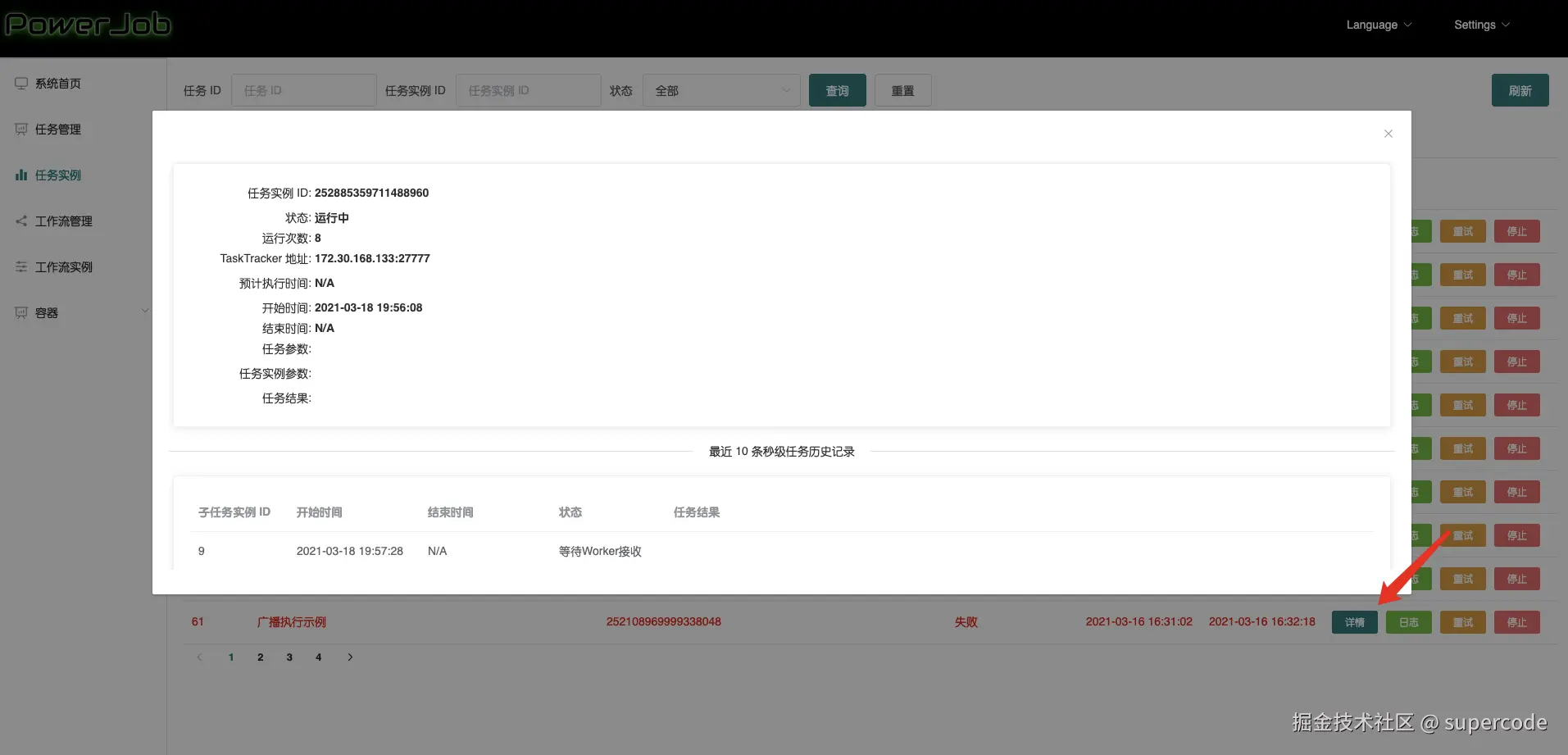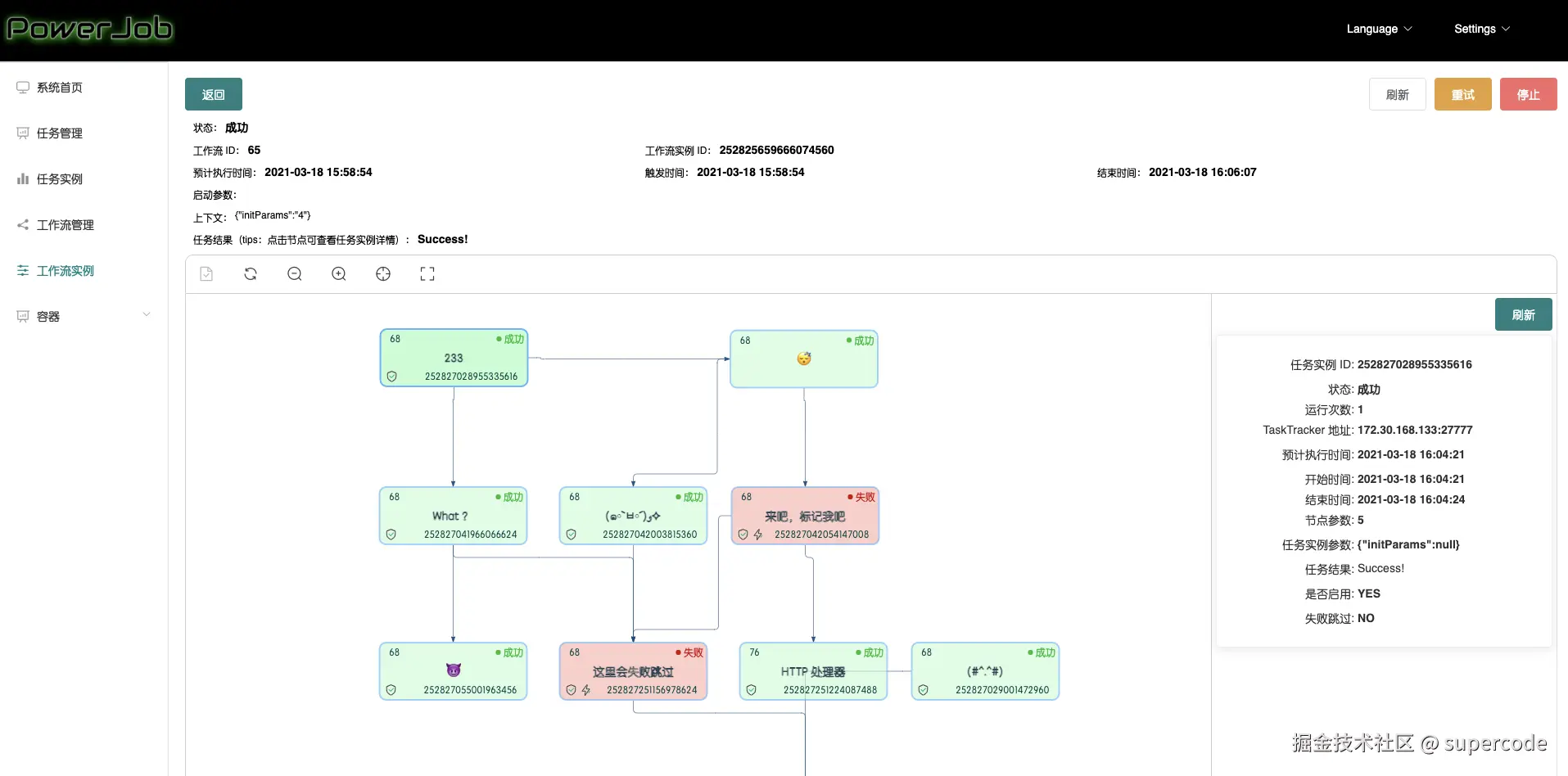 - 工作流任务实例 TAB 显示由 PowerJob 调度的工作流内运行的子任务实例。