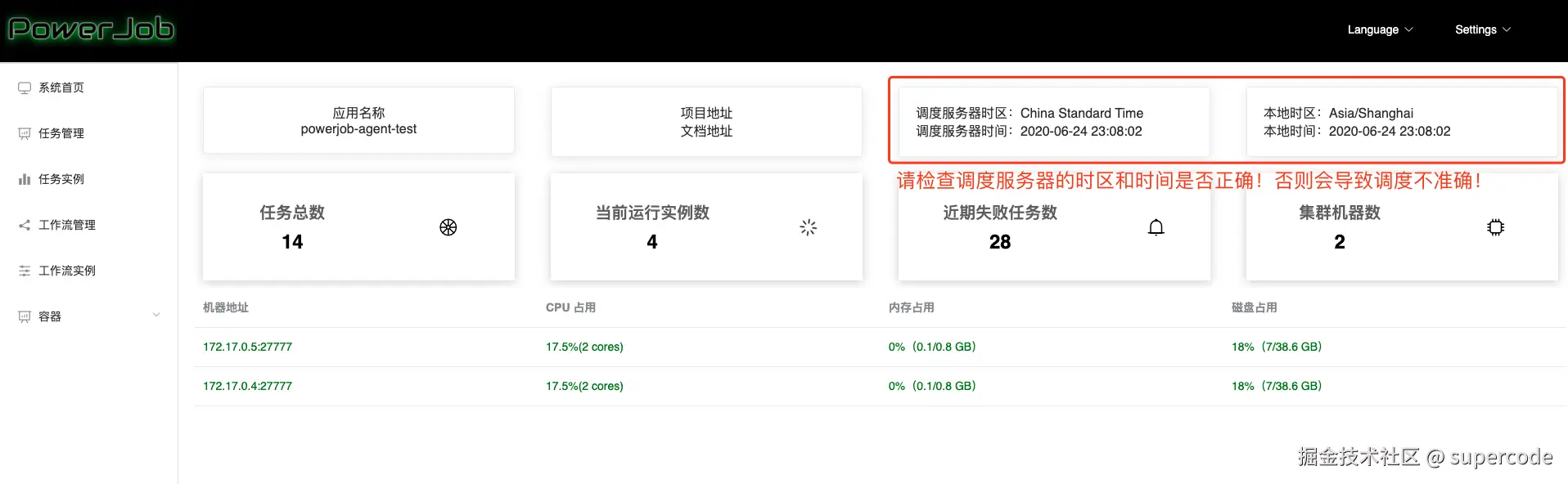 展示了系统整体的概览和集群 Worker 列表,同时提供服务器时间和本地时间的对比来确保调度的准确性。