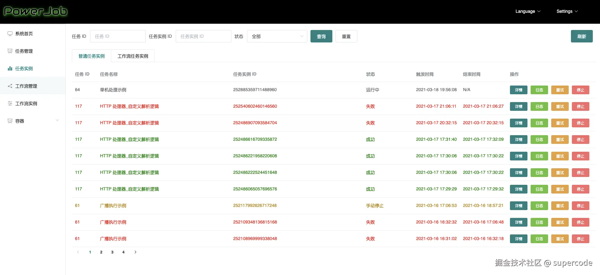 - 普通任务实例 TAB 显示由 PowerJob 直接调度的任务实例。