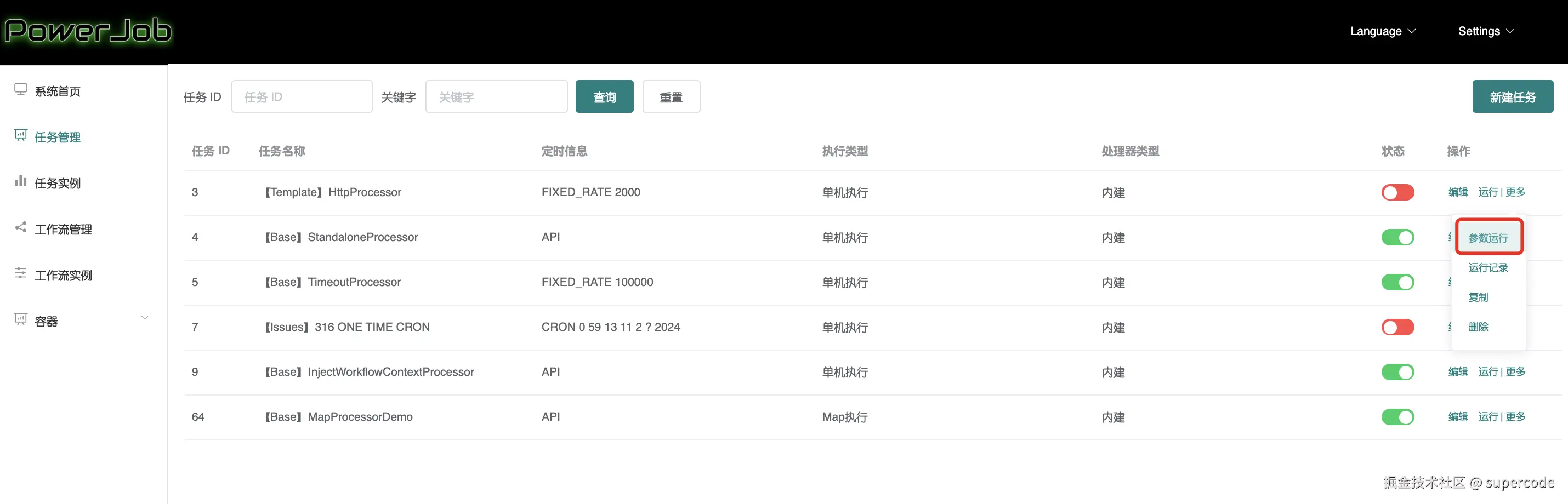 调度服务器与执行器部署完成后,录入任务或工作流信息即可正式开启调度。任务与工作流的配置可在前端页面完成(当然也可以通过 OpenAPI 完成)。本章将详细详细介绍 PowerJob 的主控(前端控制台 powerjob-console)的使用!