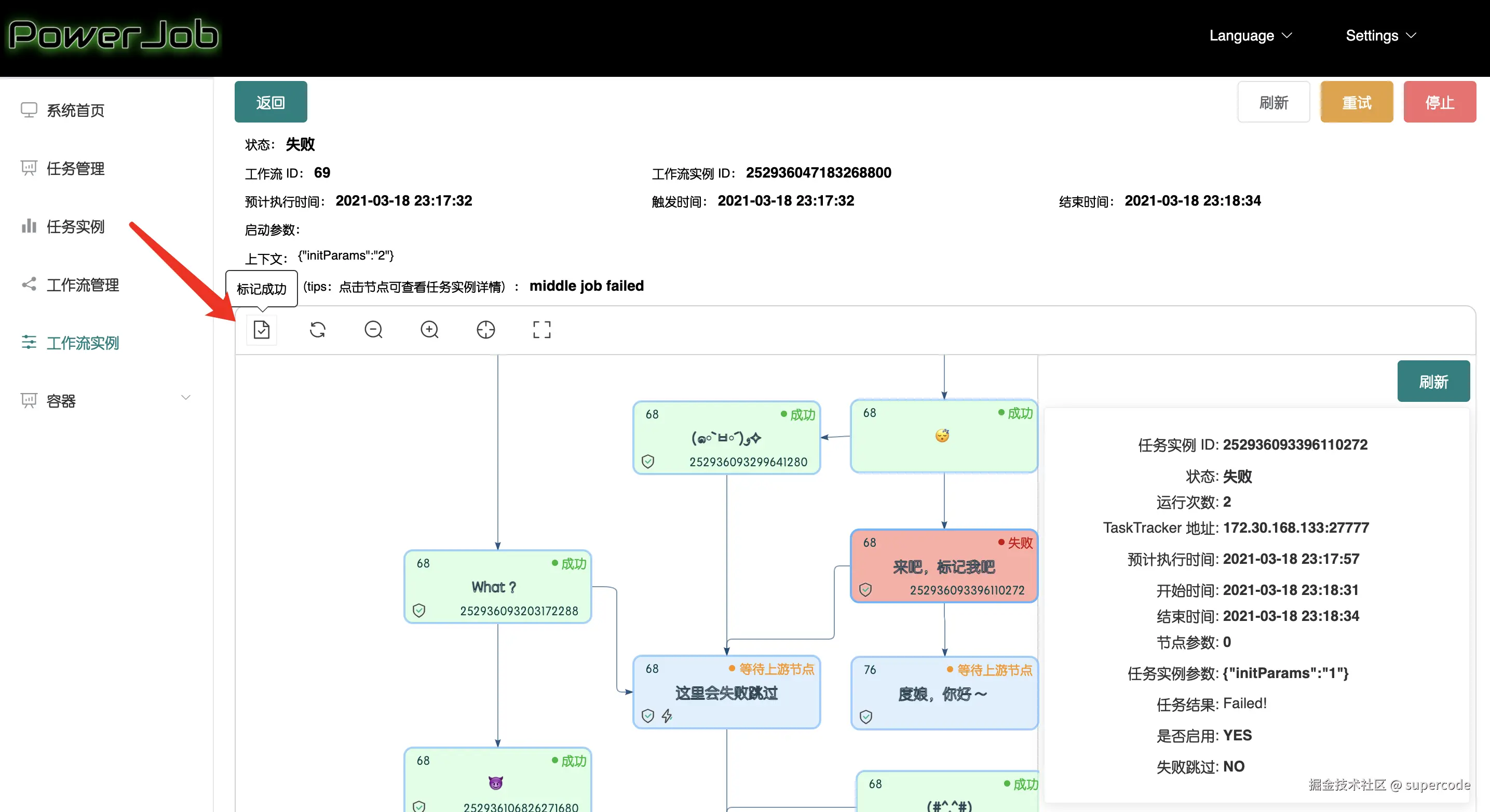 选中执行失败的节点,点击标记成功后会将其 DAG 中的节点状态置为成功(不会更改对应任务实例的状态,所以点击节点看到的任务实例详情还是失败)