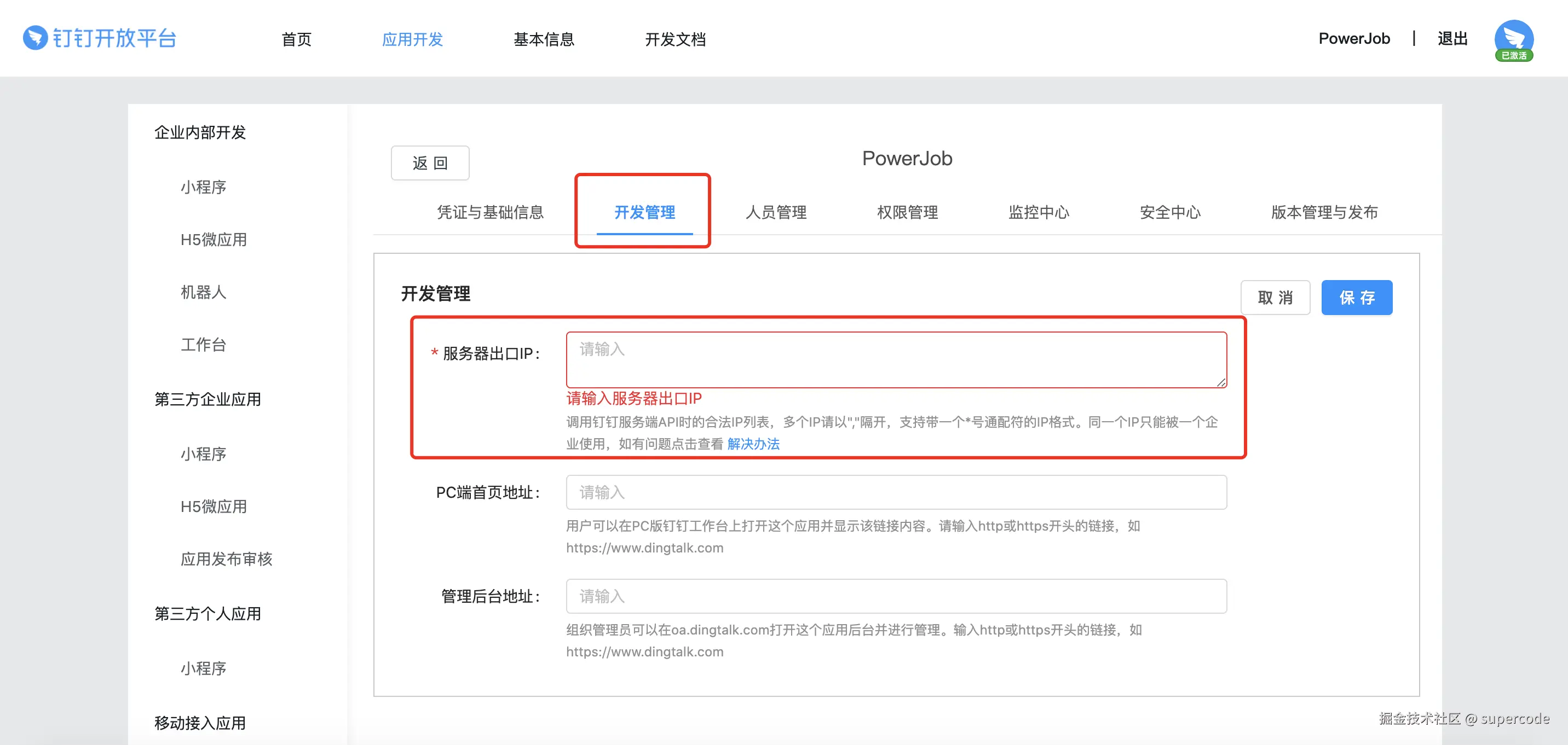 - 配置服务器出口 IP。根据钉钉限制,只有指定 IP 的服务器发送的消息才能被用户接收。因此需要前往 开发管理 tab 页录入 服务器出口IP。(注意,是服务器出口 IP 而不是 服务器本机 IP,也就是要 获得服务器的公网 IP)(一句话教程:登陆服务器执行 curl ip.sb,不会或者命令失效请自行百度)