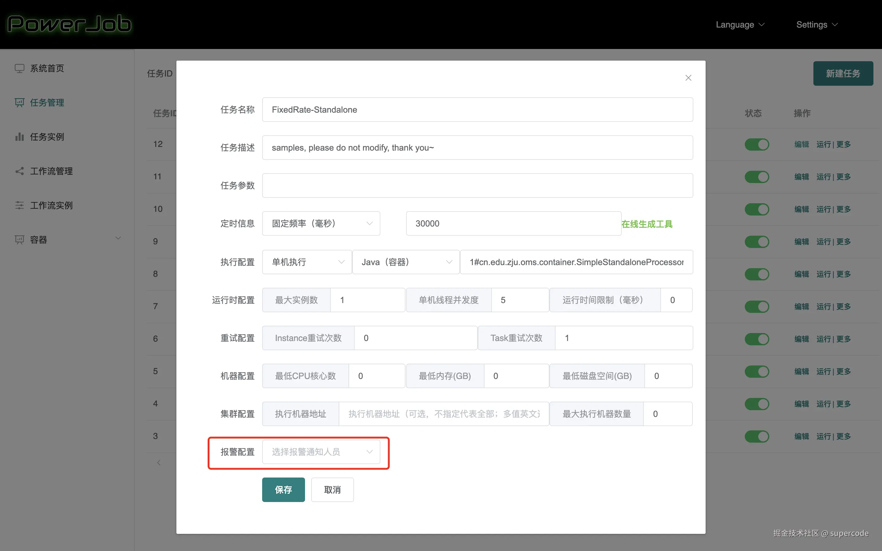 实现 tech.powerjob.server.extension.Alarmable 接口,并将实现类对象的创建交由 Spring 管理(添加 @Service 或 @Component 注解)