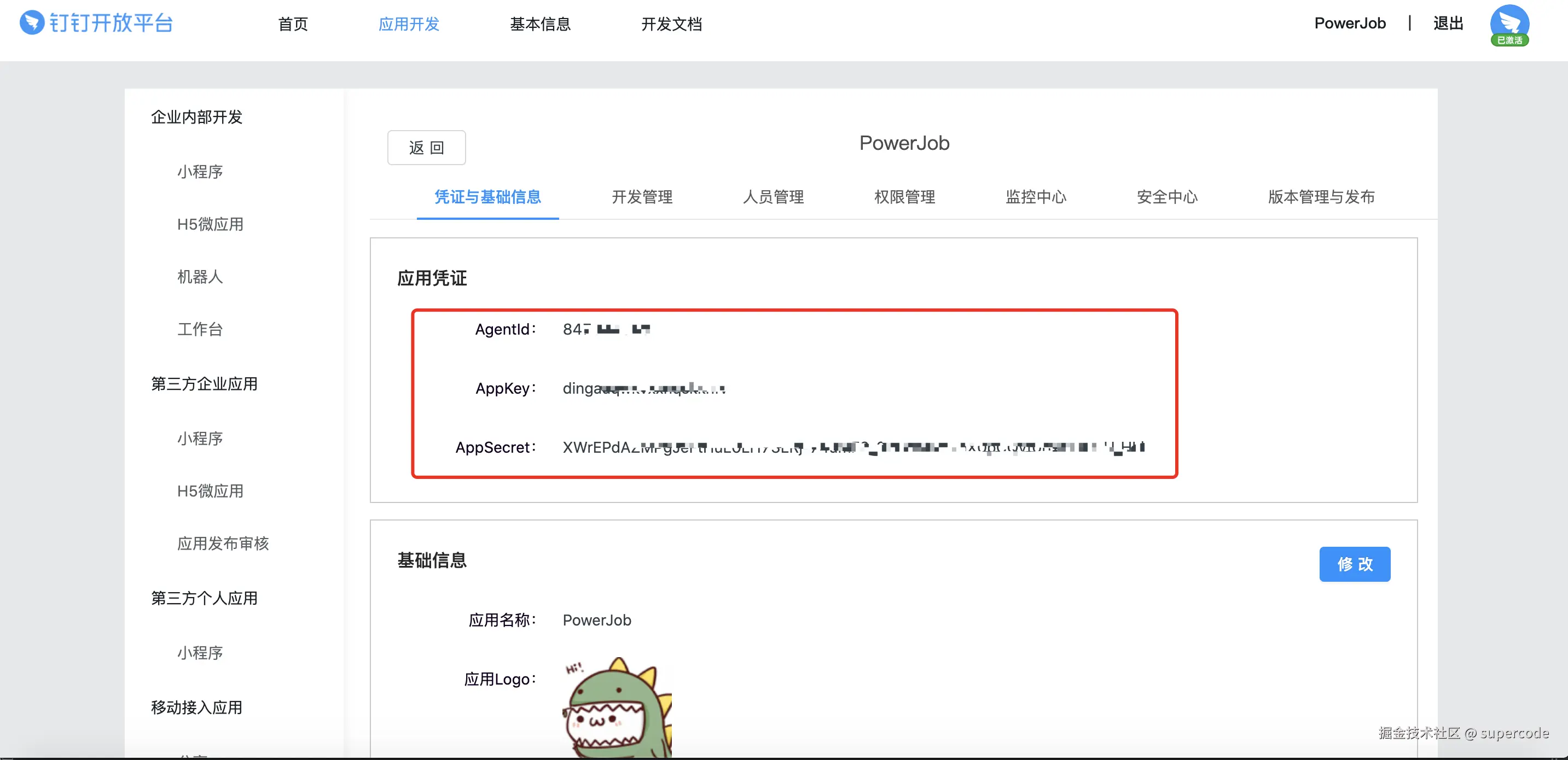 - 点击创建的小程序,进入小程序管理界面,查看应用凭证,将相关的参数复制到 powerjob-server 的配置文件中(oms.alarm.ding.agent-id、oms.alarm.ding.app-key 和 oms.alarm.ding.app-secret)。