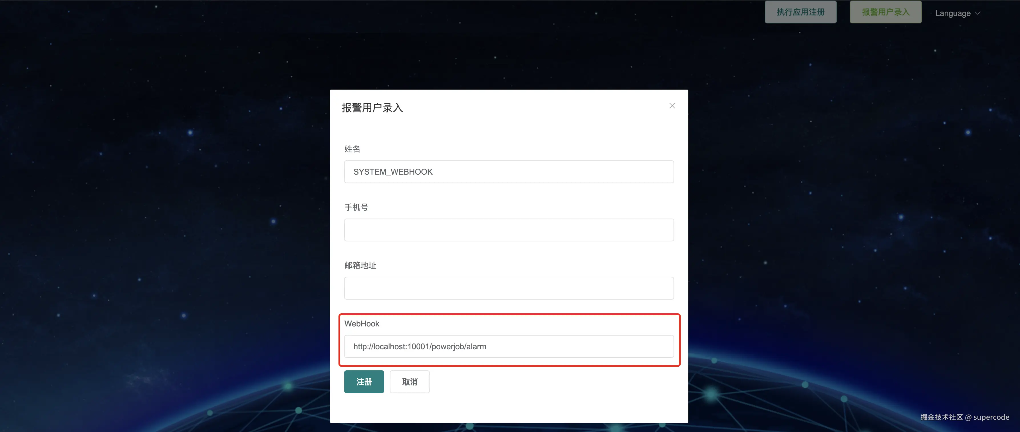 - 录入报警用户信息,其中 手机号需要关联企业钉钉账户。