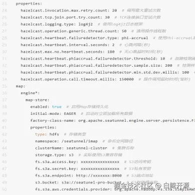 hazelcast-master.yaml优化涵盖多方面:通信上设最大重试与端口重试次数保障稳定;线程和日志配置提升资源利用与追溯性;调心跳间隔、故障检测阈值增强集群故障感知;启用Map持久化,用HDFS存储,配S3信息确保数据可靠存储访问。