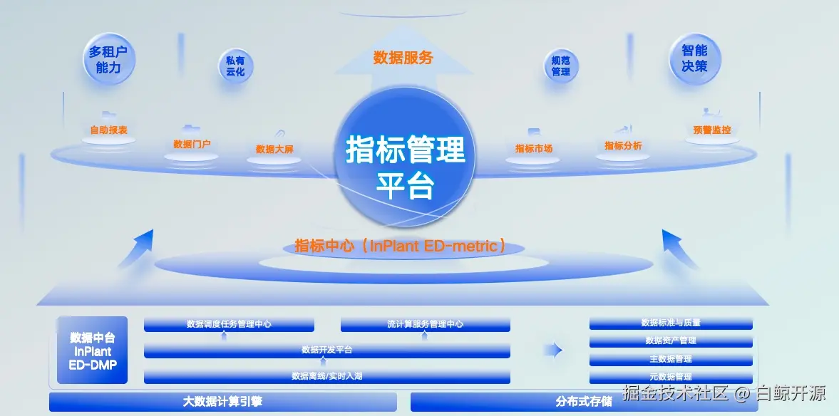 指标中心(InPlant ED-metric)为上层提供基础支撑,指标管理平台基于此构建,具备自助报表、数据门户、数据大屏、指标市场、指标分析、预警监控等功能,最终向上输出多租户能力、私有云化、规范管理、智能决策四类数据服务,形成从数据底层到服务应用的完整运行逻辑。