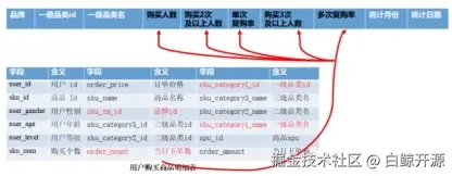 用于存储用户的互动、消费等行为数据,包含各类用户活动信息,如评论、点赞、收藏、分享、GMV等字段。每张宽表大约包含60-200个字段,满足多维度的用户分析需求。