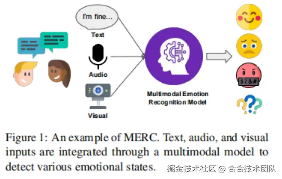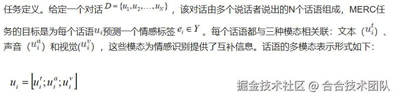 然而,人类的情感通常是通过多种感官渠道来传达的,包括听力、视觉和语言。因此,近期的研究越来越多地关注对话中的多模态设置,这一领域被称为对话中的多模态情感识别(MERC)。研究者们通过整合不同模态的上下文信息,旨在识别特定话语背后的情感状态,这些信息通常包括微妙的个人情感,如快乐、愤怒和仇恨,从而提高对话中情感识别的准确性。 图1展示了一个包含文本、声学和视觉输入的ERC示例。