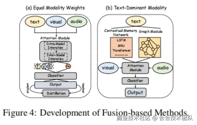 在MERC中,异构多模态特征的有效融合至关重要,但这一过程因交互建模时引入的噪声而变得极具挑战性。Transformer架构通过其自注意力机制,促进了MERC方法在捕捉跨模态和上下文依赖方面的进步。为了增强跨模态的互动,最近的方法在Transformer的基础上采用了定制的融合策略。论文将这些方法称为基于融合的方法,并在图4中进行了说明。一些方法通过促进模态间的平等互动来提高鲁棒性,而其他方法则采用主辅模式,通常以文本为核心,其他模态提供补充信号。