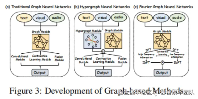 对话可以自然地被解释为图结构,因为话语之间存在内在的相关性和依赖性。对话通常涉及多轮互动,具有复杂的依赖和交互模式,这些可以通过图神经网络(GNNs)的边结构进行有效建模(Scarselli等,2009)。随着对多模态对话理解的兴趣日益增加,GNNs的应用已从文本数据扩展到多模态输入(Liu等,2024a)。此外,最近的方法还集成了辅助模块(如卷积、对比学习和融合),以提升性能。图3展示了基于图的方法的最新进展。论文将它们分为传统图、超图和傅里叶图神经网络。