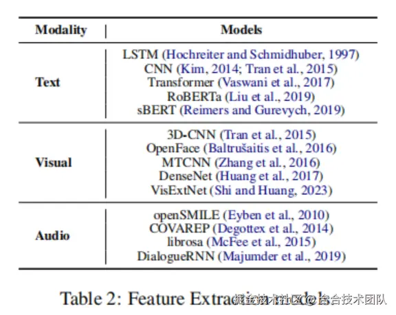**特征提取。**为了实现有效的多模态分析,必须首先从每个模态流(文本、音频、视觉)中提取特征。主流方法通常在这一初始阶段分别处理这些模态。尽管核心提取技术往往有重叠,但在多模态设置中,关键区别在于这些特征的使用目的和后续应用。在单模态情感识别中,提取器的目标是在单一模态内捕捉足够信息以进行情感分类。表2概述了本文调查的多模态研究中常用的特征提取模型。