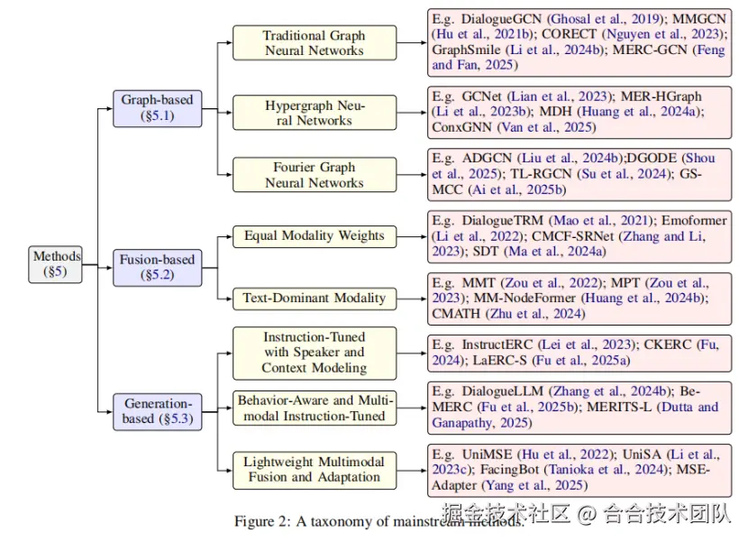 本节探讨了MERC任务的最新方法。论文从三个角度进行了总结:基于图的方法、基于融合的方法以及基于生成的方法。图2展示了这些方法及其子类别的概述,并附有代表性示例。