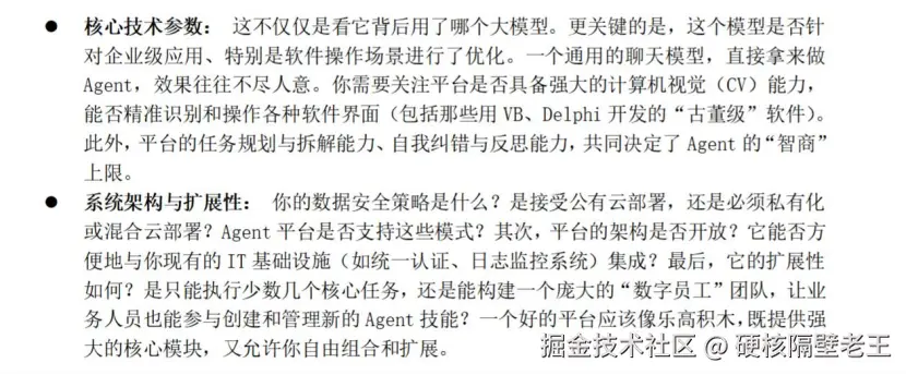 在明确场景后,我们再来看技术。评估一个Agent平台,可以从以下几个维度入手: