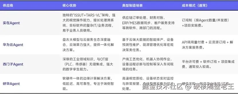 先说结论,对于智能制造企业而言,不存在“最好”的Agent,只有“最合适”的。像华为云和西门子这类巨头在云端和工业底层具备无可比拟的优势,但对于大量存在于企业内部、跨系统、非标准的复杂业务流程,以实在智能为代表的专业Agent厂商,凭借其独特的“人机协同”设计理念和对业务流程的深度理解,往往能提供更灵活、更高性价比的解决方案。