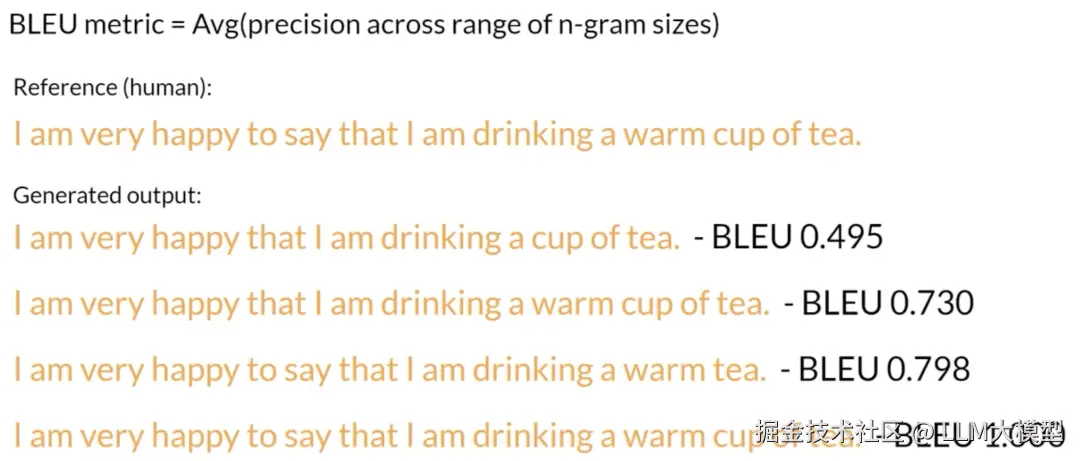 - n-gram 精准率: BLEU 分数是不同 n-gram 尺寸(通常从 1-gram 到 4-gram)的精准率的加权平均值 。