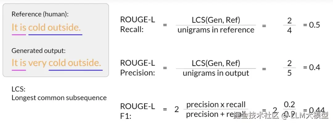 ROUGE-L: 基于**最长公共子序列(Longest Common Subsequence, LCS)**的匹配 。ROUGE-L 不要求匹配的词语必须连续,只要它们在两个文本中出现的顺序相同即可,这使得它更能衡量句子级别的流畅性和结构。