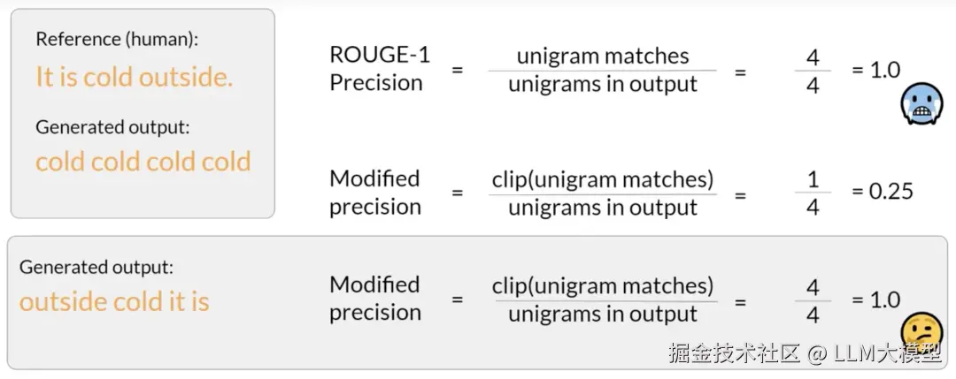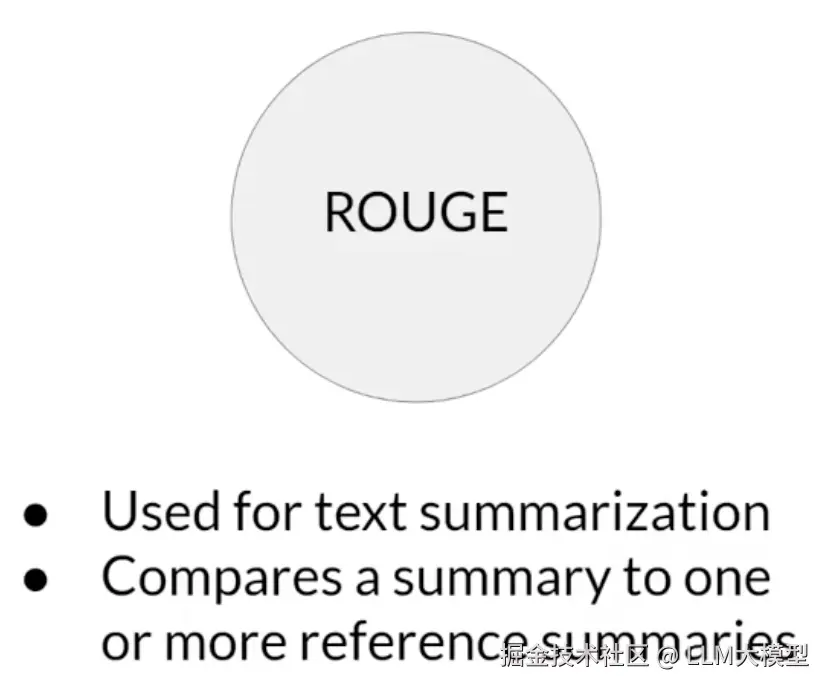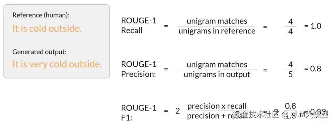 ROUGE(Recall-Oriented Understudy for Gisting Evaluation)是一种主要用于文本摘要任务的评估指标 。它通过比较模型生成的摘要和人工撰写的参考摘要,来衡量它们的重叠程度 。常见的 ROUGE 类型包括:ROUGE-1,ROUGE-2,ROUGE-L, ROUGE-clipping。