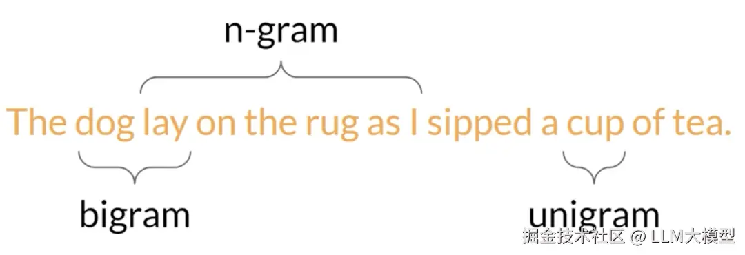 - Unigram: 单个词语,比如句子 "The dog lay on the rug as I sipped a cup of tea." 中的 "The" 或 "dog"
