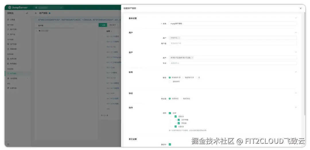 然后进行资产授权。在JumpServer中选择“资产授权”→“创建”,填写该资产授权名称,并进行设置,设置有效期后点击“提交”按钮。相关设置信息如下:
