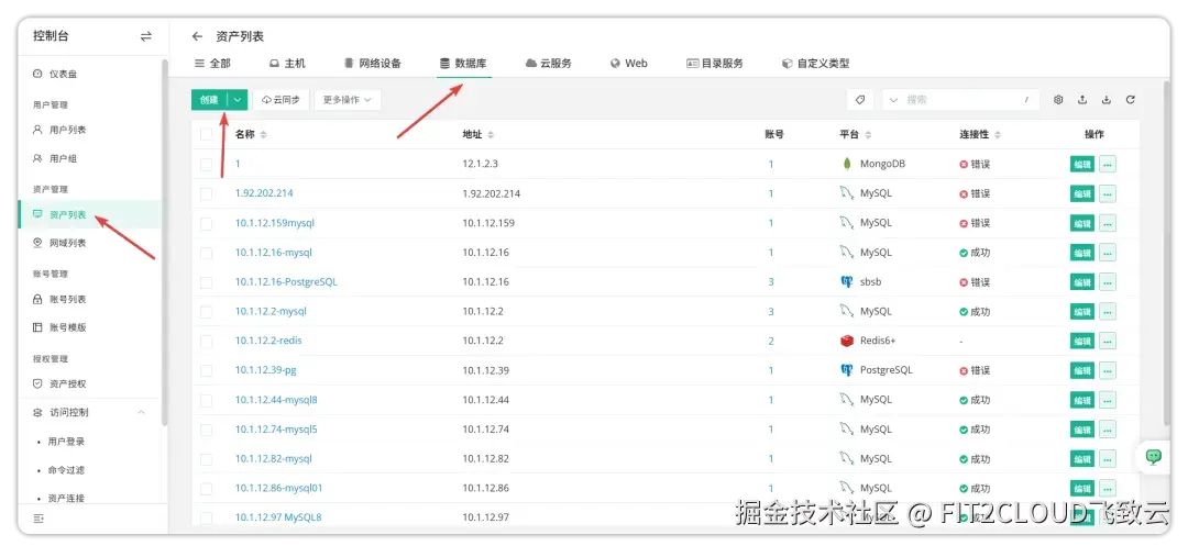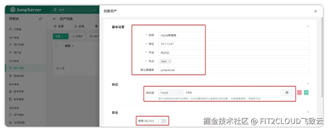 首先是添加资产。登录JumpServer控制台,依次选择“资产列表”→“数据库 ”→“创建”,在平台类型中选择“MySQL”,填写基本信息如下: