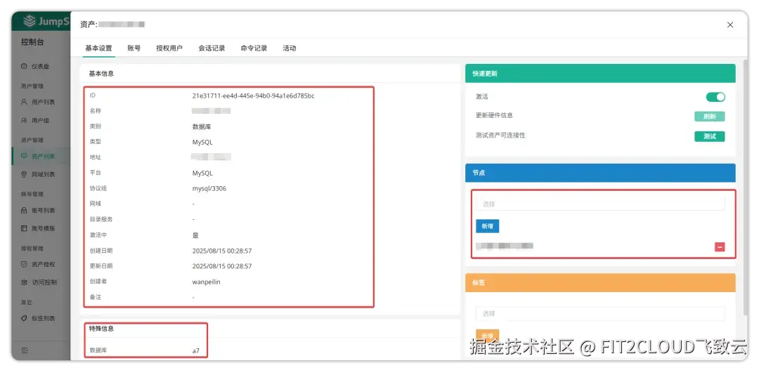 在JumpServer控制台可以查询资产基本信息,在JumpServer左侧菜单选择“资产列表”选项,点击对应MySQL资产名称,可以获取IP地址、端口、资产编号、所属节点等信息。