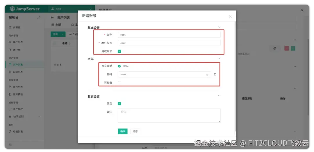 接下来添加数据库资产账号。在资产列表中新增账号,填写信息如下,然后点击“确认”按钮。