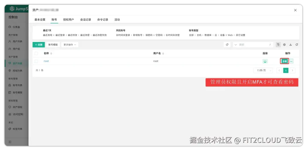 资产账号密码查询的方法为:在JumpServer依次选择“资产列表”→对应SQL资产名称→账号,可以查看该资产的所有被纳管的系统账号用户名,点击“查看”按钮可以查看密码。注意:密码默认隐藏,需要具有管理员权限且开启MFA才能查看和重置。