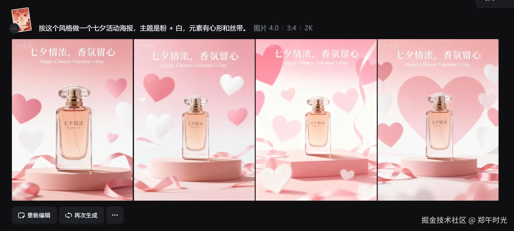“按这个风格做一个七夕活动海报,主题是粉 + 白,元素有心形和丝带。”