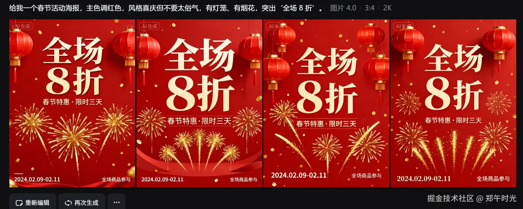 “给我一个春节活动海报,主色调红色,风格喜庆但不要太俗气,有灯笼、有烟花,突出‘全场 8 折’。”