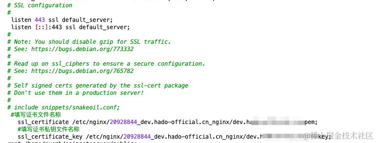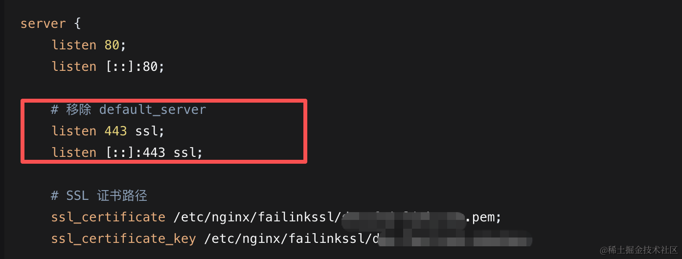 但是如果你是一个服务器上放置了多个域名,并都要配置ssl证书,就只能有一个443后面跟上default_server,另外的nginx配置不能有default_server,不然会报错: