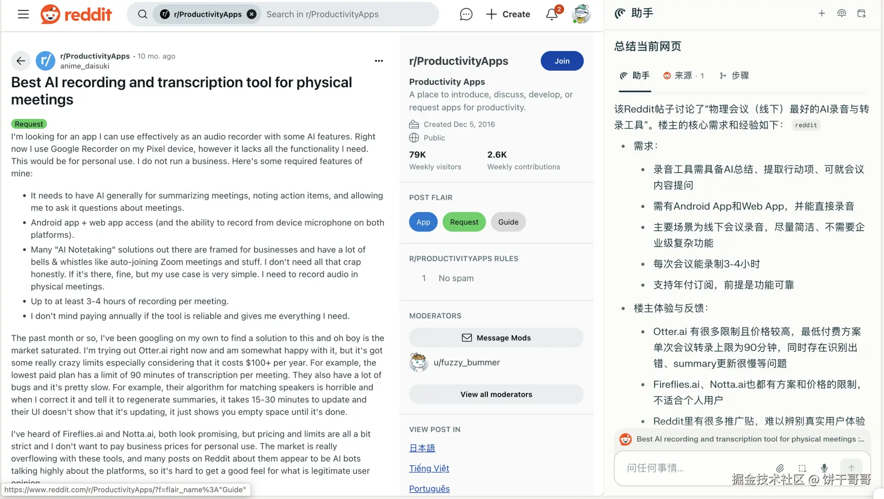 在 r/ProductivityApps 帖 Best AI recording and transcription tool for physical meetings 以及What's the Best Meeting Transcription App?中,多数用户反映: