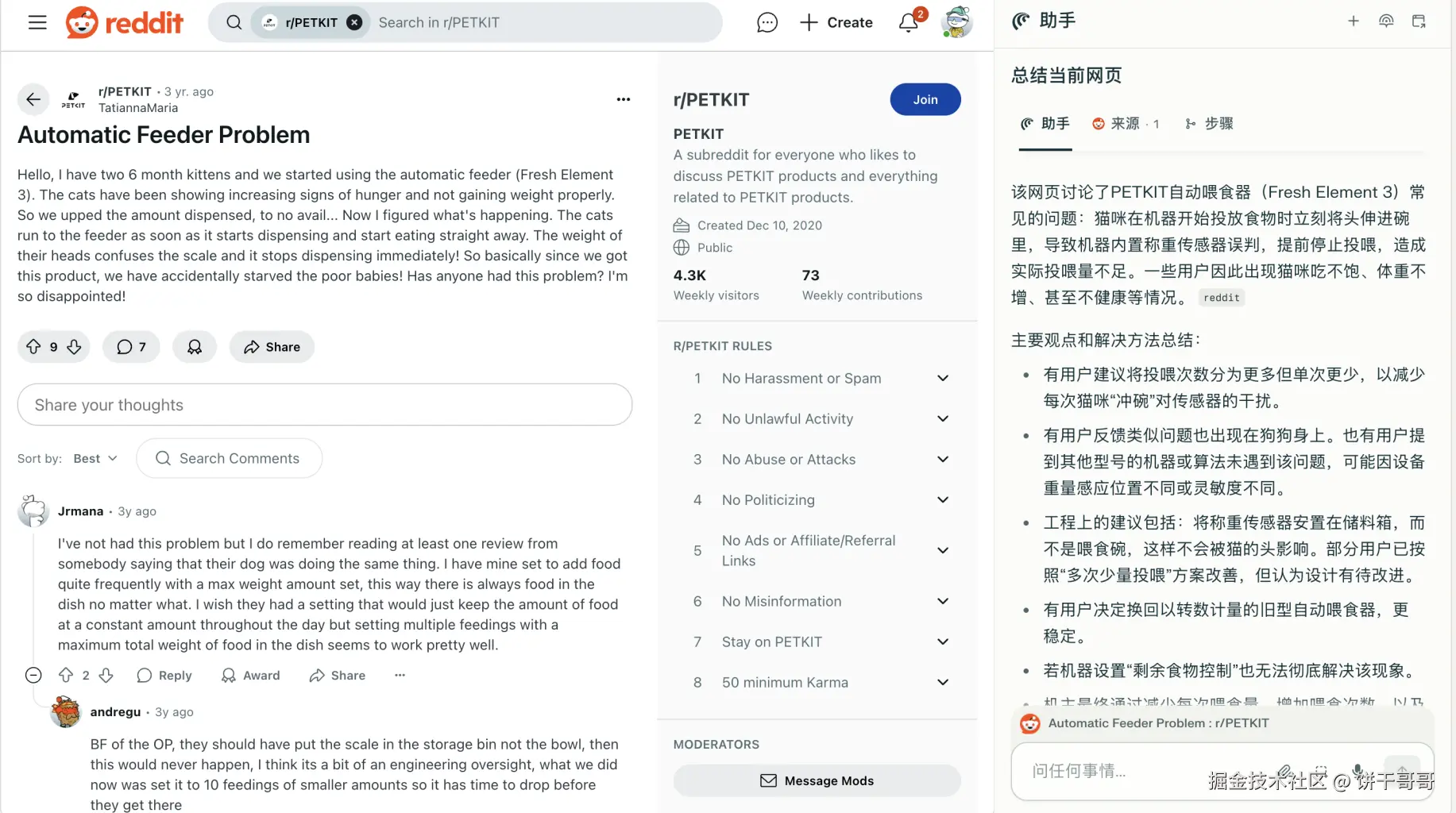 而在 Reddit 的讨论帖下,用户会直接留言——“我的自动喂食器一到夏天保鲜湿粮就不管用了,我只好自己DIY改造!”