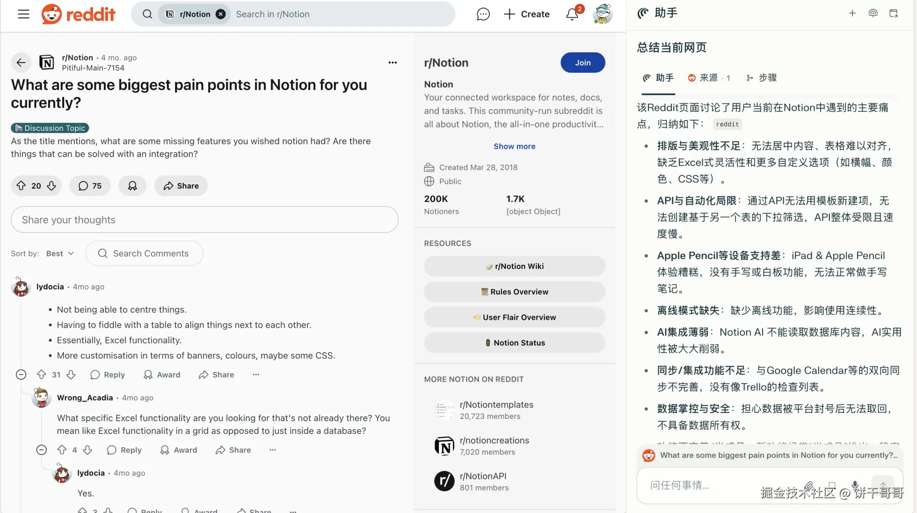 在 r/Notion 讨论帖 What are some biggest pain points in Notion for you currently?,以及相关讨论中,多位用户直接吐槽 Notion 最大的短板是: