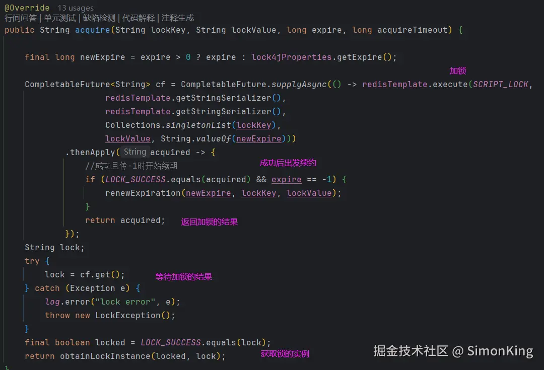 通过ForkJoin线程池启动线程,加锁后根据参数执行是否续约。然后等待加锁的结果,并返回加锁的结果。