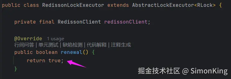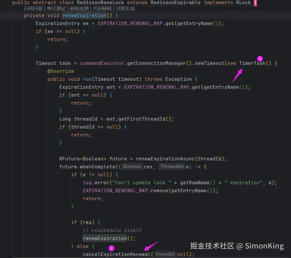 几乎没有代码。因为Redisson本身自带看门狗机制。我们追一下Redisson的源码。当执行lock()->tryAcquire()->tryAcquireAsync()->scheduleExpirationRenewal()->renewExpiration()