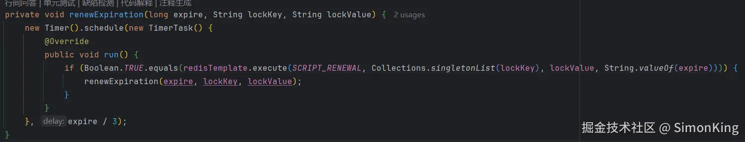 同样是先获取判断,然后在续约。都是通过Lua脚本处理的。但是要这里要说的是,通过new Timer()启动了一个调度任务,每到过期时间的三分之一,就会触发续约逻辑。