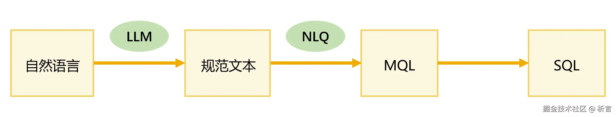 在此流程中,增加了一个规范文本的环节。从自然语言到规范文本的转换由 LLM 实现;从规范文本到 MQL 的转换由专门的 NLQ 引擎完成;从 MQL 到 SQL 的转换则就是常规的代码翻译程序了。
