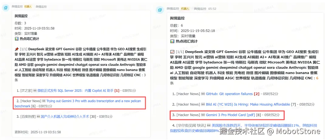 真正让我瞠目结舌的,却不是模型本身,而是它身后那款全新的开发工具——Google Antigravity IDE。消息一出,我的舆情监控小应用第一时间也推送了这个好消息。