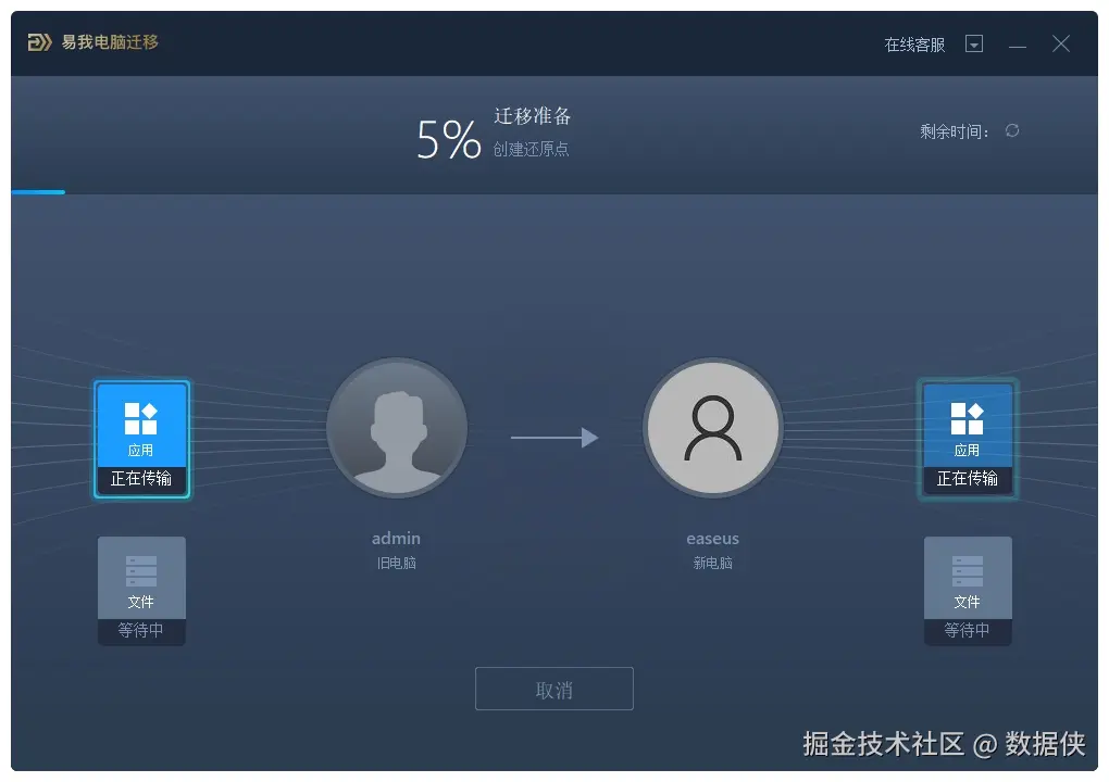(1)易我电脑迁移将开始枚举源计算机中所有可以传输的应用程序、数据和账号。