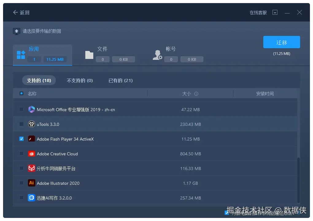 (2)选择需要传输的应用程序或软件,并选择迁移到的目标路径。