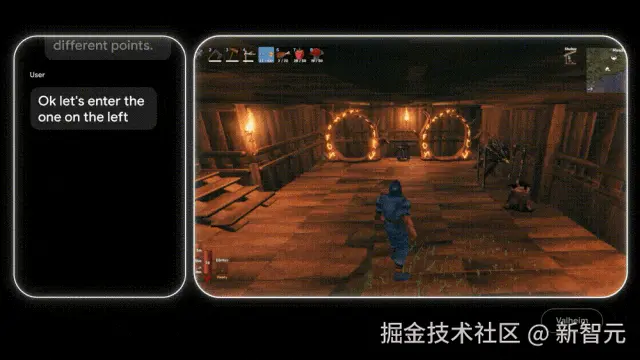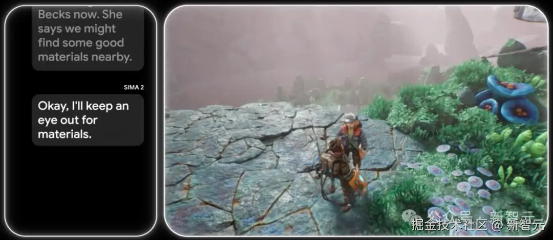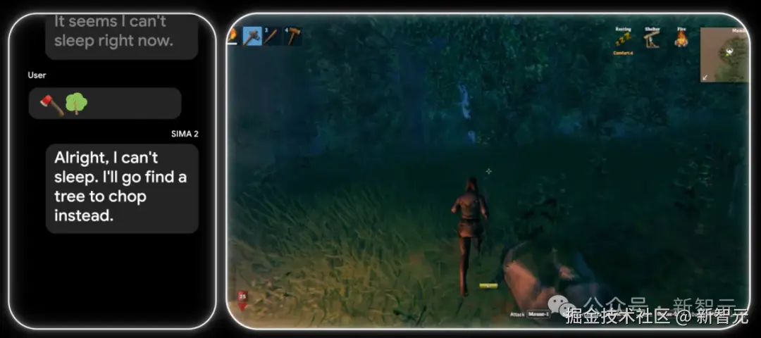 SIMA 2 现在可以在未经预训练的情况下攻克全新的游戏。(左边是 Gemini 的推理过程,右边是 SIMA 在操作游戏)