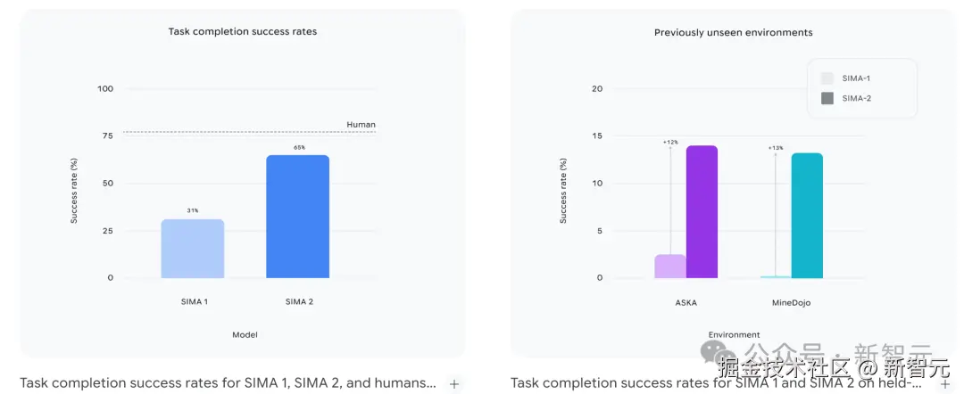 下面这个图展示 SIMA 2 相对 SIMA 1 能力的巨大提升。